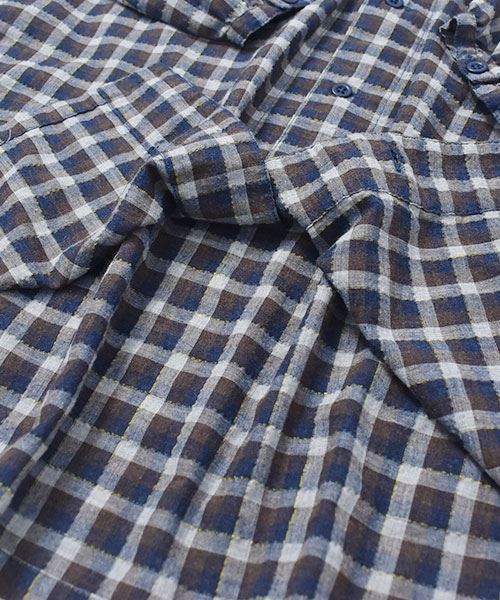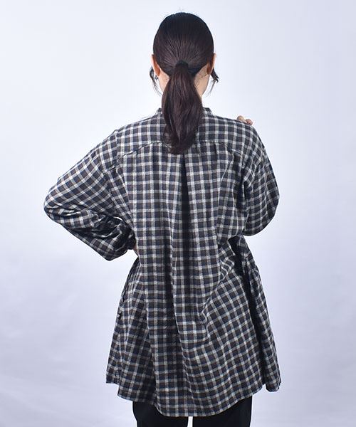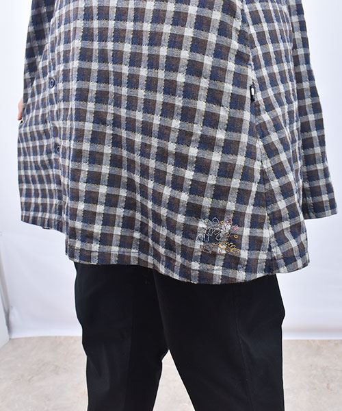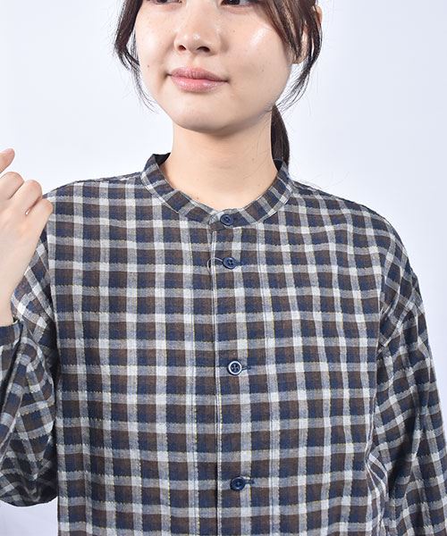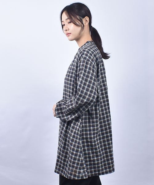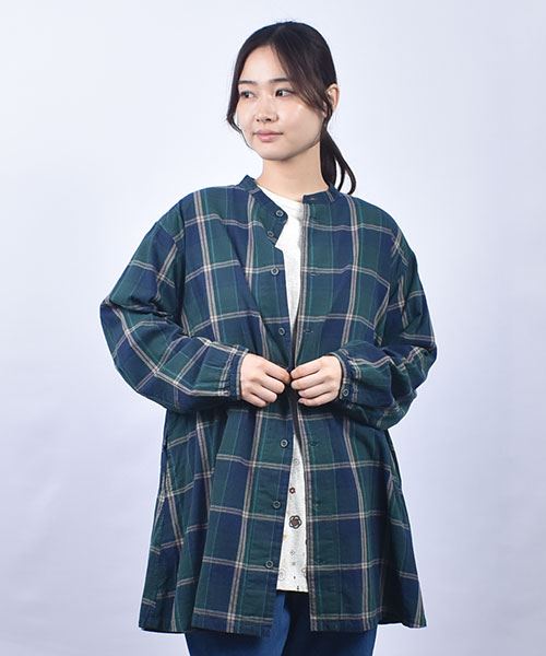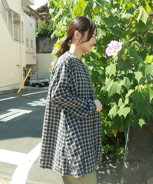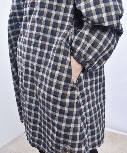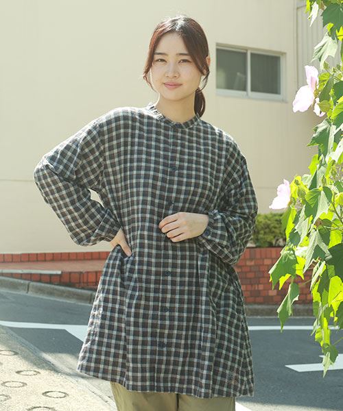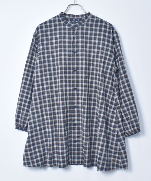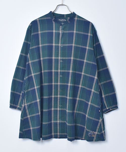 drug store's チェック スタンドカラー ヨコピンタック入り 刺繍 チュニック