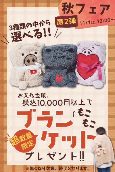 期間中お支払商品金額税込10,000円以上で選べるブランケットをプレゼント!!