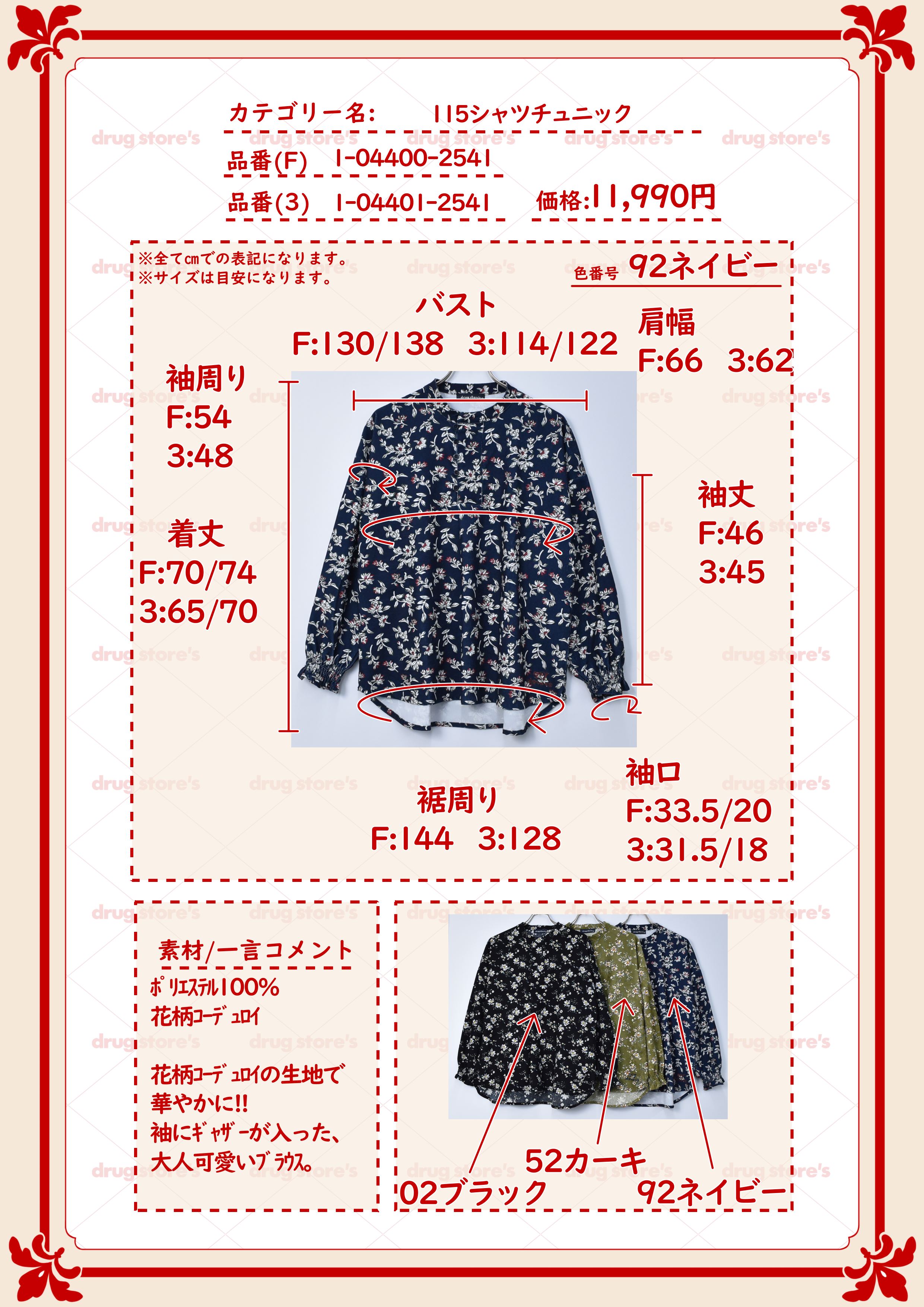 drug store's 花柄 コーデュロイ スタンドカラー プルオーバー ブラウス