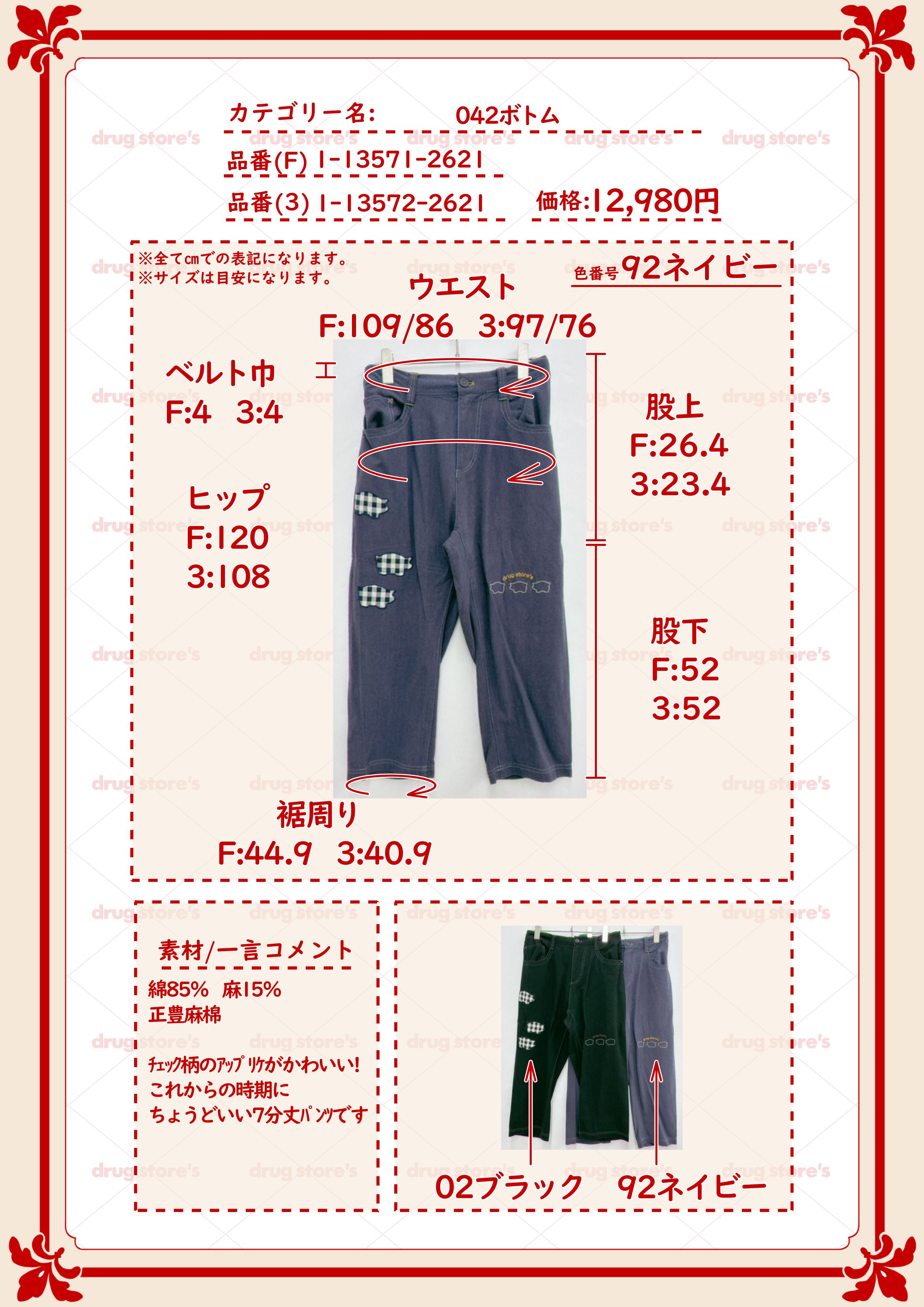 【パンツ】 チェックアップリケ 7分丈 パンツ