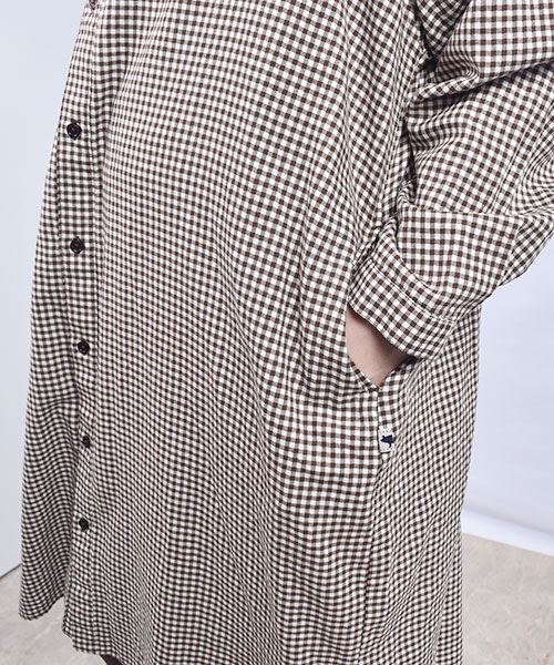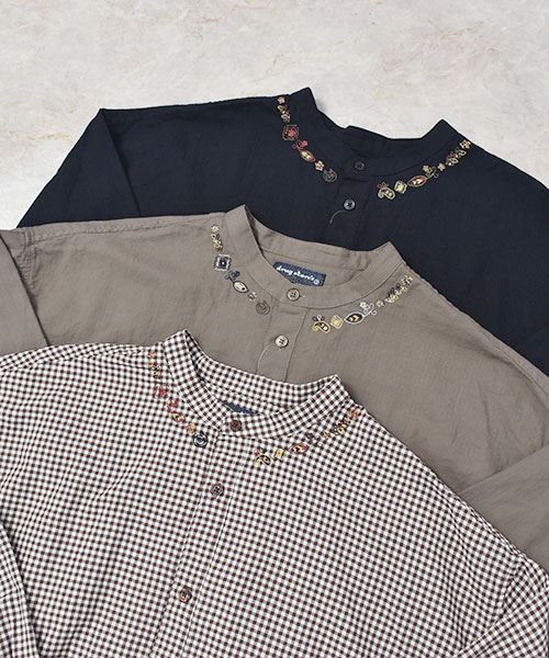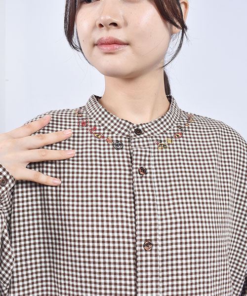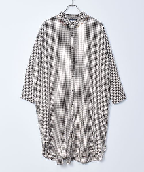 drug store's ギンガムチェック スタンドカラー花刺繍 BIG ワンピース