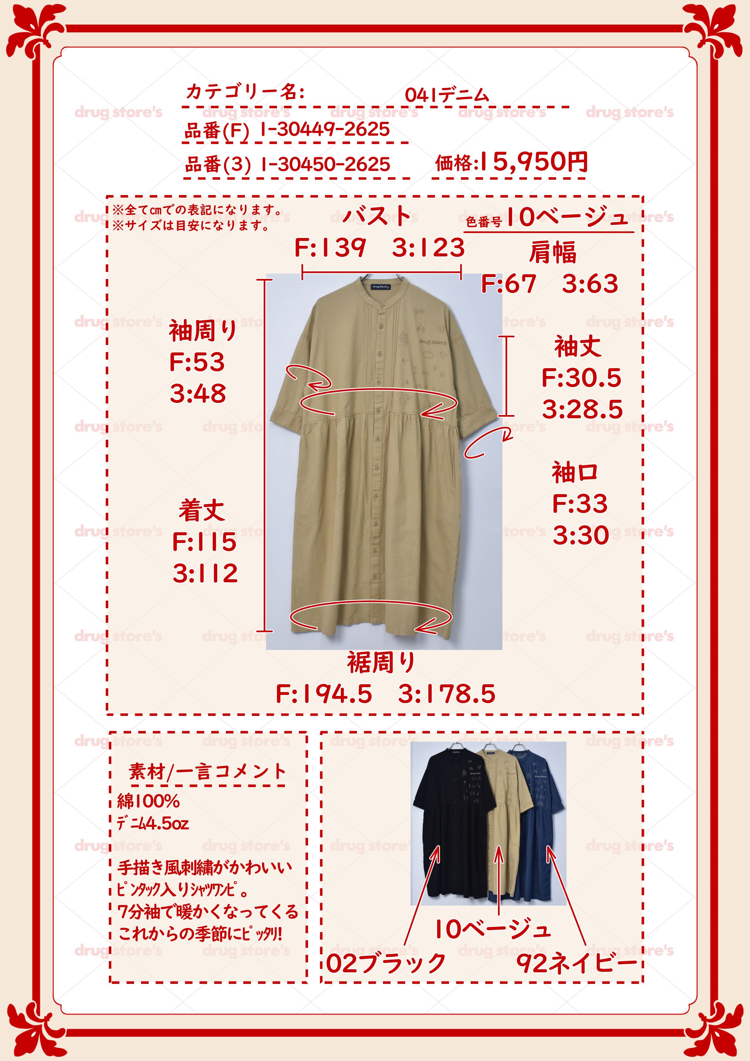【ワンピース】 手書き風刺繍 ピンタック デニムワンピース