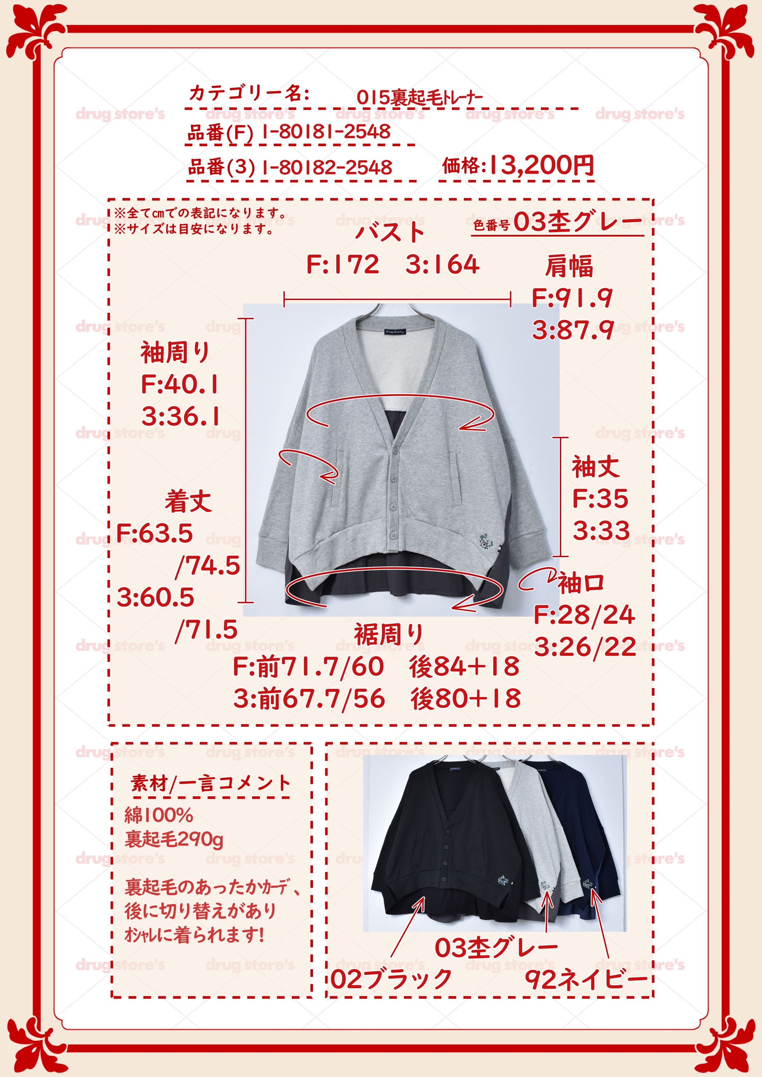 【カーディガン / 裏起毛】 バック切替 カーディガン