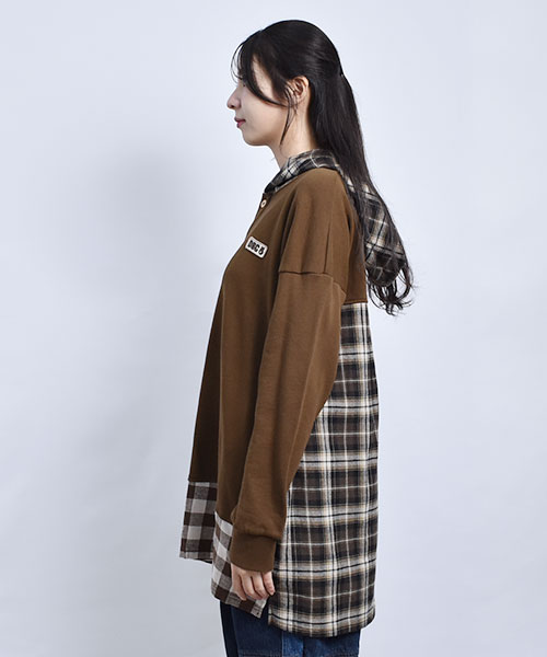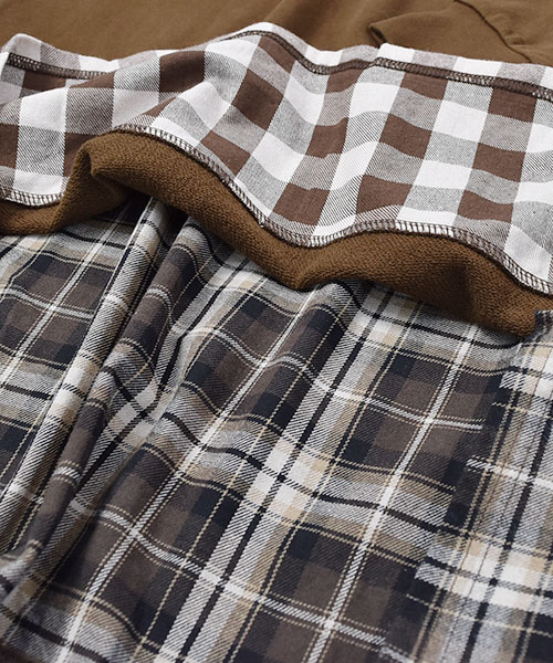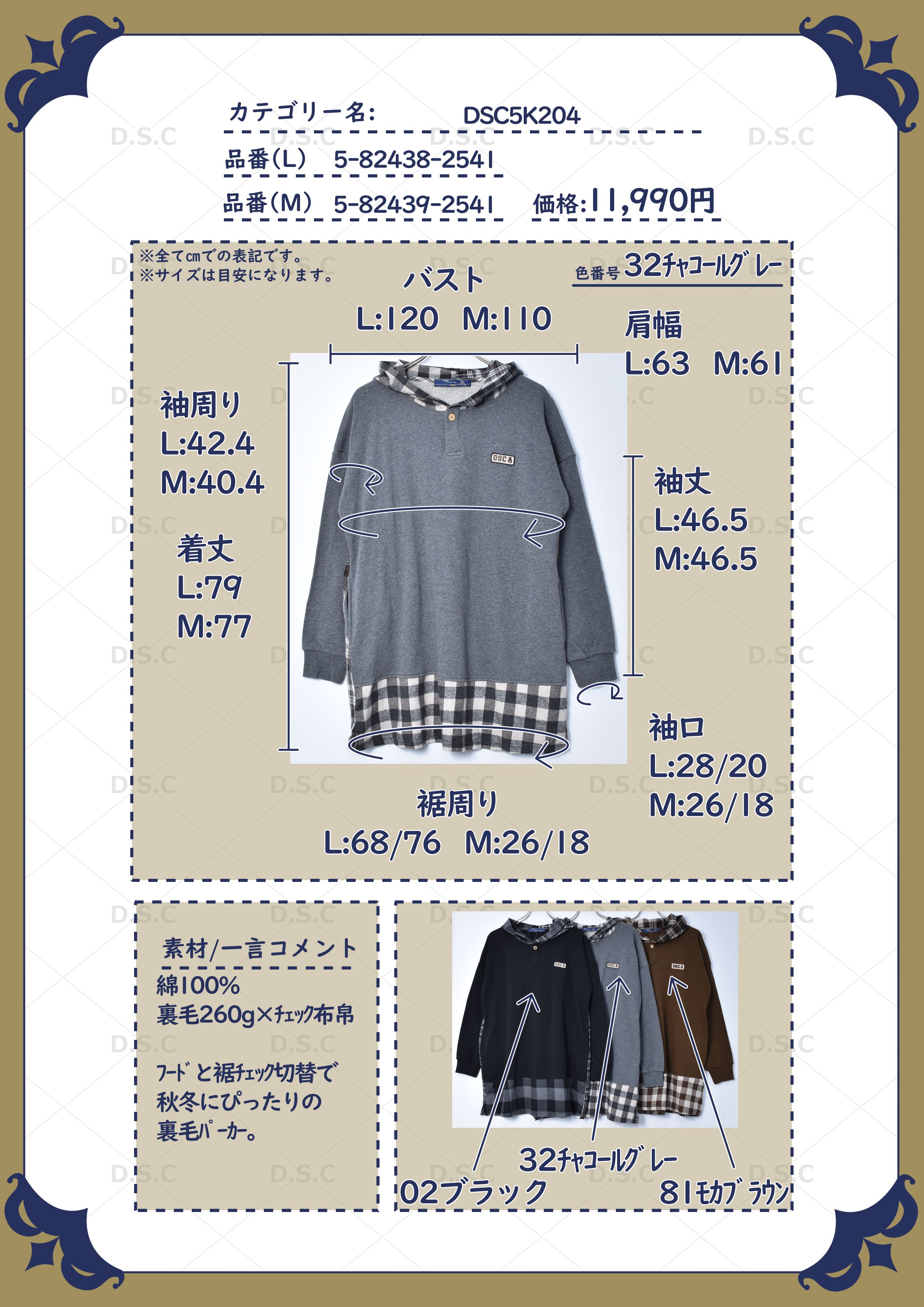 D.S.CLUB 裏毛 裾重ね チェック 丈長 パーカー